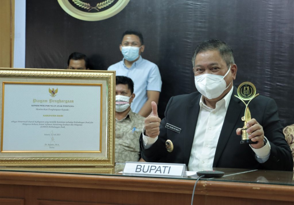 SIDIKALANG, pelitarakyat.com – Pemerintah Kabupaten Dairi berhasil meraih ‘Anugerah KPAI 2021’ dari Komisi Perlindungan Anak Indonesia (KPAI). Penghargaan diserahkan secara virtual oleh Ketua KPAI, Susanto kepada Bupati Dairi, Dr. Eddy Keleng Ate Bupati pada Kamis (22/7/2021).