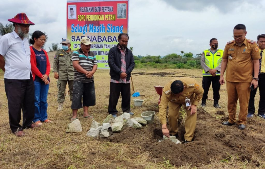 Bupati Dairi Dr Eddy Keleng Ate Berutu menghadiri dan melakukan peletakan batu pertama pembangunan sopo pendidikan petani di tanah yang dihibahkan Benpa Hisar Nababan yang berlokasi di Perumahan/Kaplingan New Normal, Kecamatan Sitinjo, Kabupaten Dairi, Selasa (24/5/2022) siang.