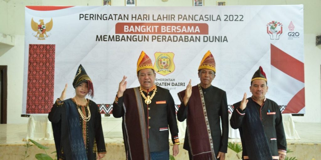 SIDIKALANG, pelitarakyatcom – Bupati Dairi DR. Eddy Keleng Ate Berutu bersama beberapa unsur Forkopimda, Kepala Pengadilan Negeri Sidikalang, Monita Honeisty Br. Sitorus, S.H., M.H, Anggota DPRD, Manat Sigalingging, para asisten dan kepala OPD mengikuti upacara peringatan hari lahir pancasila 1 Juni secara daring dari Balai Budaya Sidikalang.