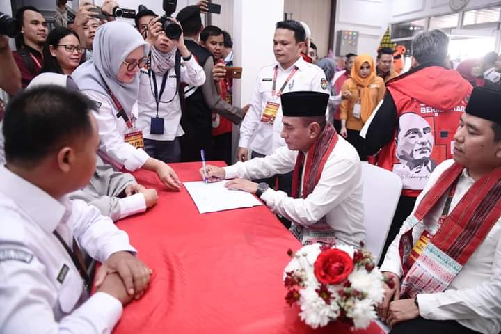 Bapaslon yang diusung Partai Demokrasi Indonesia Perjuangan (PDIP), Partai Hanura, Partai Buruh, Partai Ummat, Partai Gelora, dan PKN itu disambut Sekretaris KPU Sumut, Sapran Daulay.