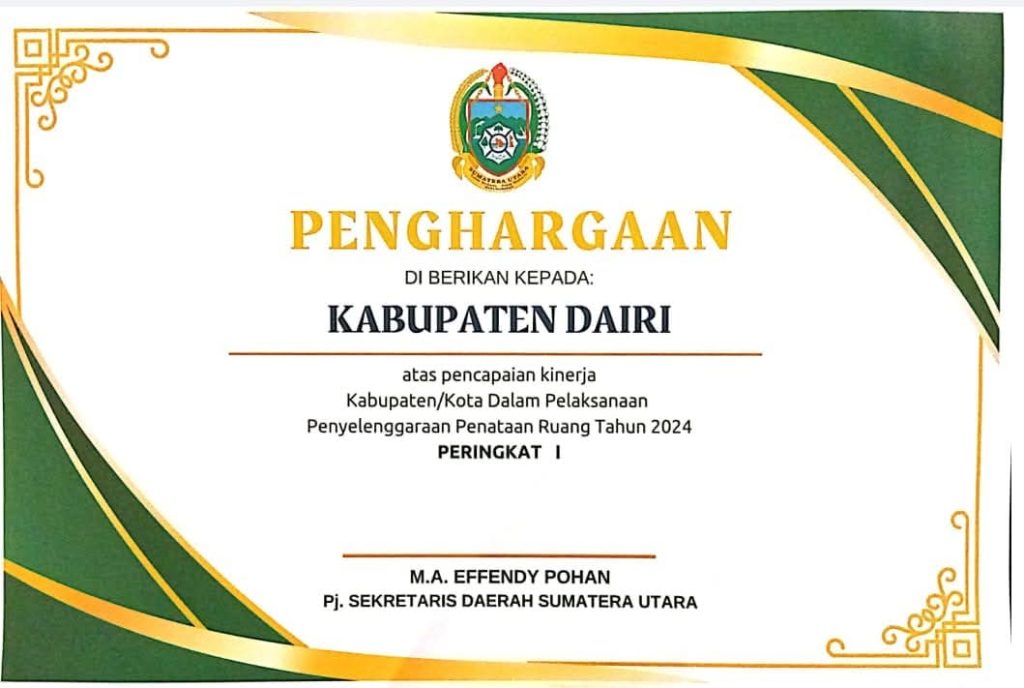 Pada Acara Tindak Lanjut Hasil Penilaian Kegiatan Kabupaten/Kota untuk Peningkatan Penilaian Tahun 2025-2026 dalam Penyelenggaraan Penataan Ruang, Jumat (13/12/2-24) yang digelar di Hotel Travellers Suit Medan, menetapkan Kabupaten Dairi sebagai juara 1 (satu) dengan nilai 59.30 dan predikat kinerja Sedang.