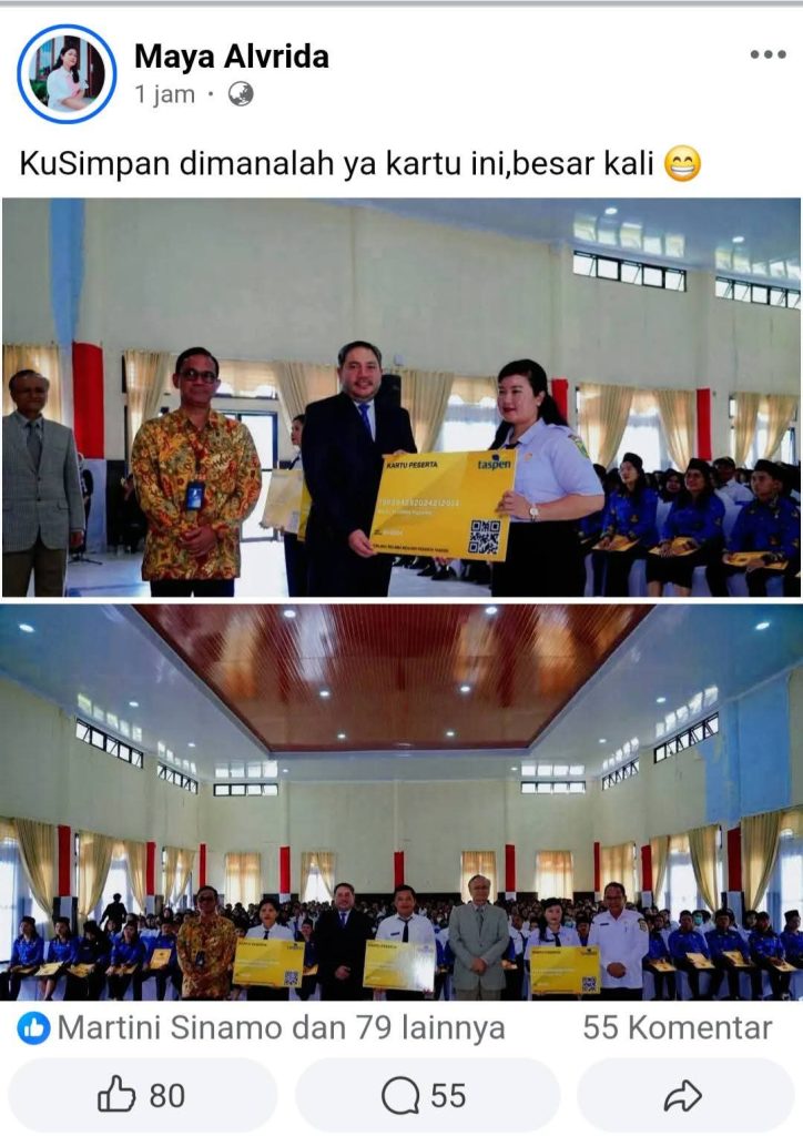 Maya Alvrida Padang, salah seorang Pegawai PPPK yang menerima Kartu Kepesertaan TASPEN dari Bupati Pakpak Bharat Franc Bernhard Tumanggor menulis unggahan di media sosial miliknya “Kusimpan dimanalah ya kartu ini, besar kali”, disertai emot tertawa bahagia. Maya menyertakan foto saat menerima duplikat kartu peserta Taspen yang berukuran cukup besar bersama Bupati Pakpak Bharat, Franc Benrhard Tumanggor.