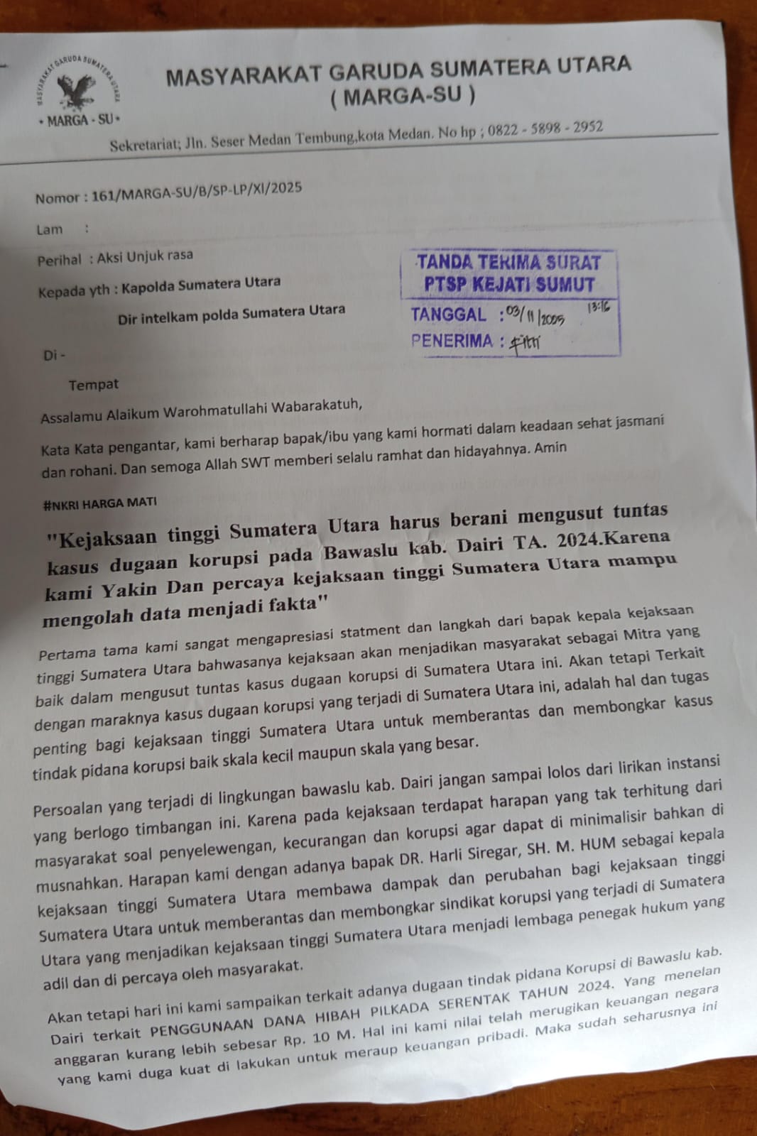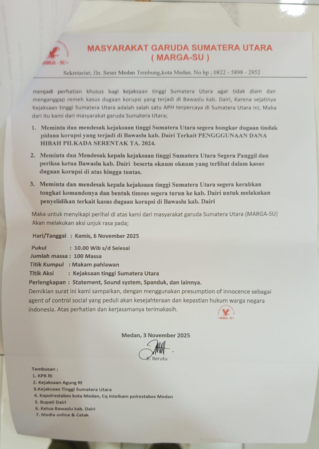 1. Meminta dan mendesak Kejatisu segera bongkar dugaan tindak pidana korupsi yang terjadi di Bawaslu Kab. Dairi terkait penggunaan dana hibah Pilkada Serentak TA. 2024.